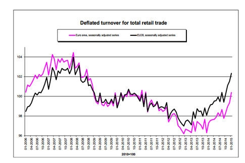 最新数据显示,欧元区1月零售销售同比增3.7% 创逾九年新高;同时欧元区综合创7个月新高,其中德法意西四大成员国企业活动均呈现扩张趋势;而在欧央行三月即将实施全面QE的窗口期间,欧元对美元汇率甚至直接创下11年新低的局面,大大有利于欧元区企业的出口。