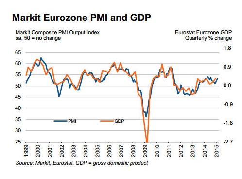 与此同时,数据显示,欧元区2月综合(PMI)终值下修为53.3,虽低于初值53.5,但高于1月终值52.6,并创下七个月高位。该指数连续20个月守在景气荣枯分水岭50之上。Markit报告称,调查预示欧元区第一季度料增长0.3%,与2014年第四季度相同。
