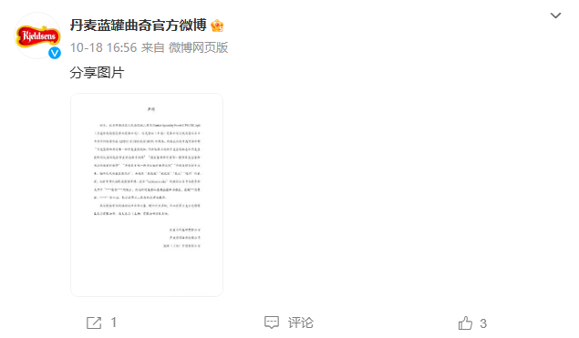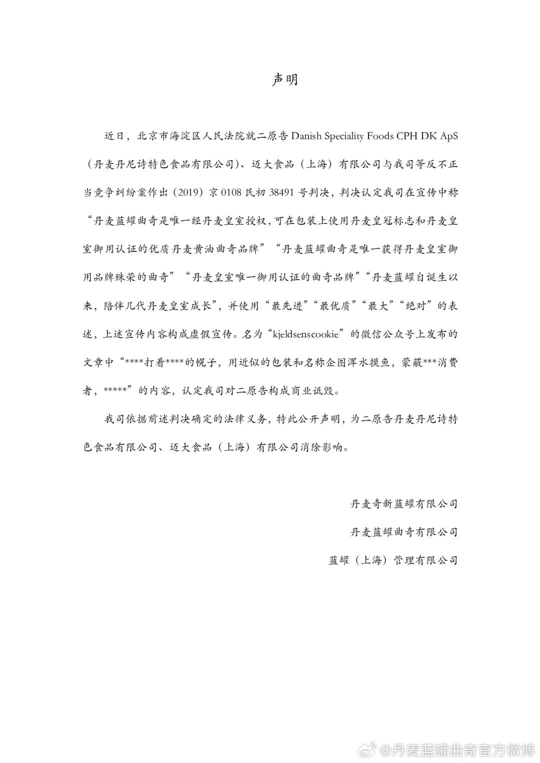 10月18日,“蓝罐曲奇”在其官方网站及官方微博发布声明,承认其存在虚假宣传及对“皇冠丹麦曲奇”的商业诋毁行为,向原告“皇冠丹麦曲奇”出品公司Danish Speciality Foods CPH DK ApS(丹麦丹尼诗特色食品有限公司,以下称“丹尼诗公司”)及其经销商迈大食品(上海)有限公司(原尤益嘉(上海)食品商贸有限公司,以下称“迈大公司”)道歉并赔偿经济损失。