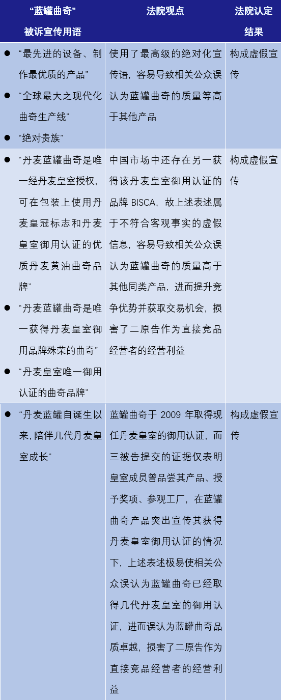 2019年,“皇冠丹麦曲奇”方面发现,市场上的“蓝罐曲奇”包装及其官方网站、微博、微信公众号、天猫和京东官方旗舰店中,使用了很多“不符合事实”的宣传信息,容易对消费者构成误导,构成反不正当竞争法第8条规定的虚假宣传行为。