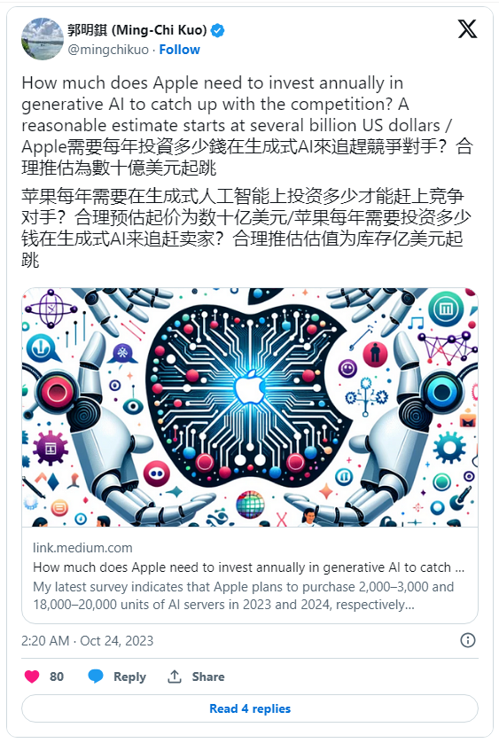 郭明錤认为苹果采购的 AI 服务器主要为最常见、用于训练和推理生成式 AI 的英伟达 HGX H100 8-GPU,明年第 4 季度的采购芯片会加入 B100。